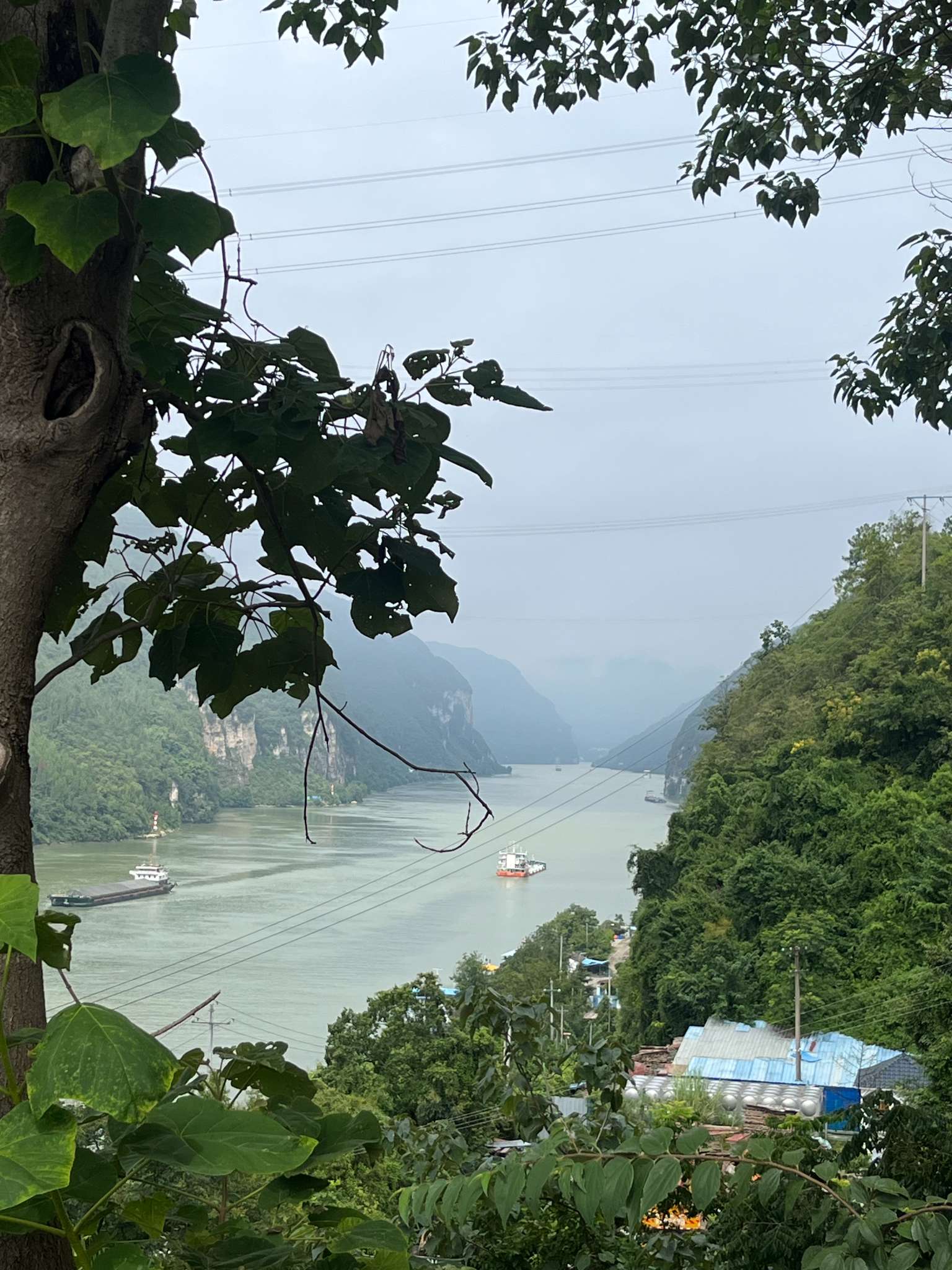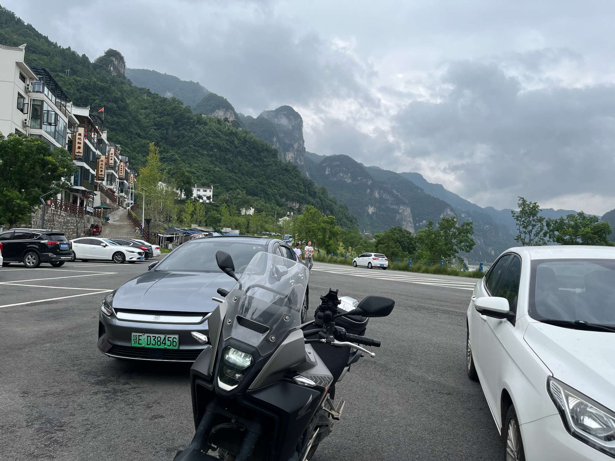 还未到三游洞,就已经在山边行驶了一段了,前后的车都不急不慢有序前行。几辆汽车开着窗,驾车人的手搭在窗边。山里空气如此清新,岂由得我这摩托佬独享?一路看远近的山,山间的弯曲的路,悬空的桥,山边的房子。山高耸着,江水被夹在时而宽阔时而狭小的山脚间川流不息,一艘游船行驶得很快,船头插着一面迎风飘扬大旗,甲板上密密麻麻站满了人,在摄像、在欢呼、在振臂。