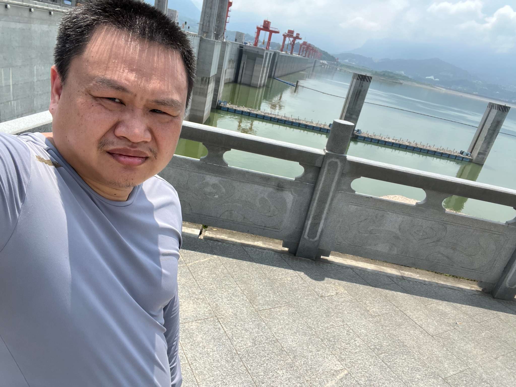最初对大山大河的新奇感过去后,就感到天越来越热,走的路越来越远,到截流纪念园这最后一个景点时,脚下有些不舒服了。在三峡大坝最佳观赏点拍了照片后,走到附近的树林找了长椅坐下歇脚,脱下靴晾着脚。这里人不多,我将脚踩在靴上,并不敢放在长椅上。拉开袜子看到脚踝至后跟处皮已经磨破了。不远处看了截流石,刚进门听导游有介绍是当年未用完的,就放在这里供参观。我穿好鞋,不太利索地走近那些黑色的三角锥,大的有一层楼高,有的明显小些,静静地摆在那里,几处离地面近的面上覆盖青苔。莫名地想起“无才可去补苍天,枉入红尘若许年”的诗句来。
