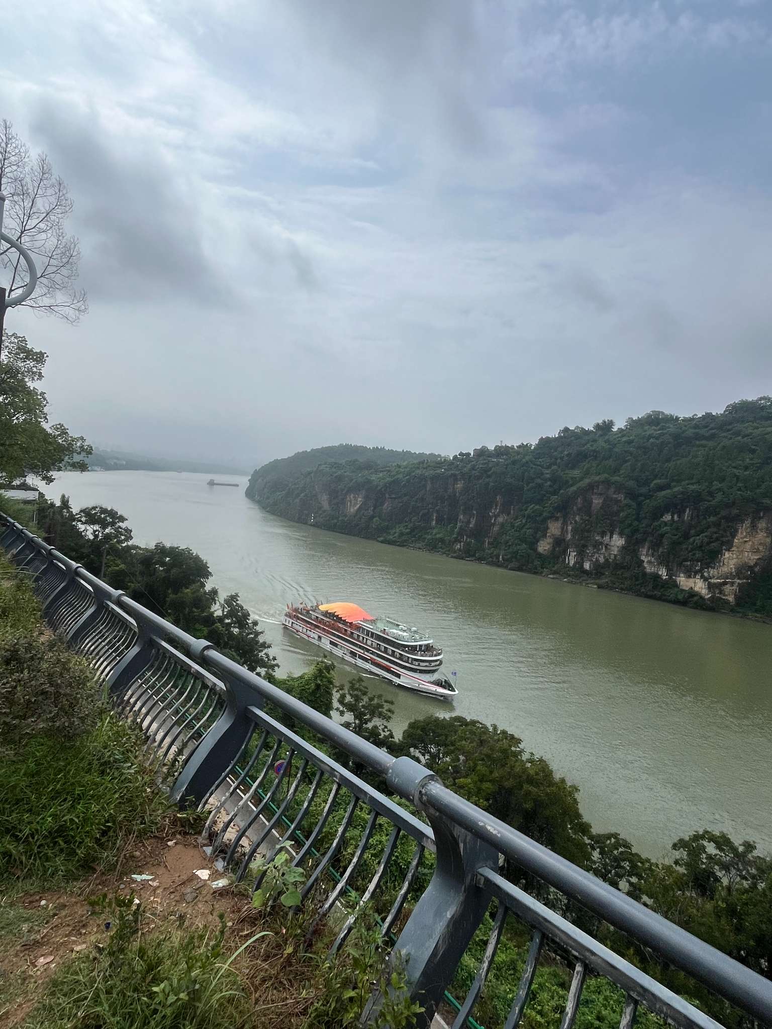 到三游洞的一路很多地方都有停车的地方,三三两两的游人扶着围栏在崖边伸头望着、拿手机拍着。三游洞近在咫尺,还是到了才停路边。忍不住立马到江边看。