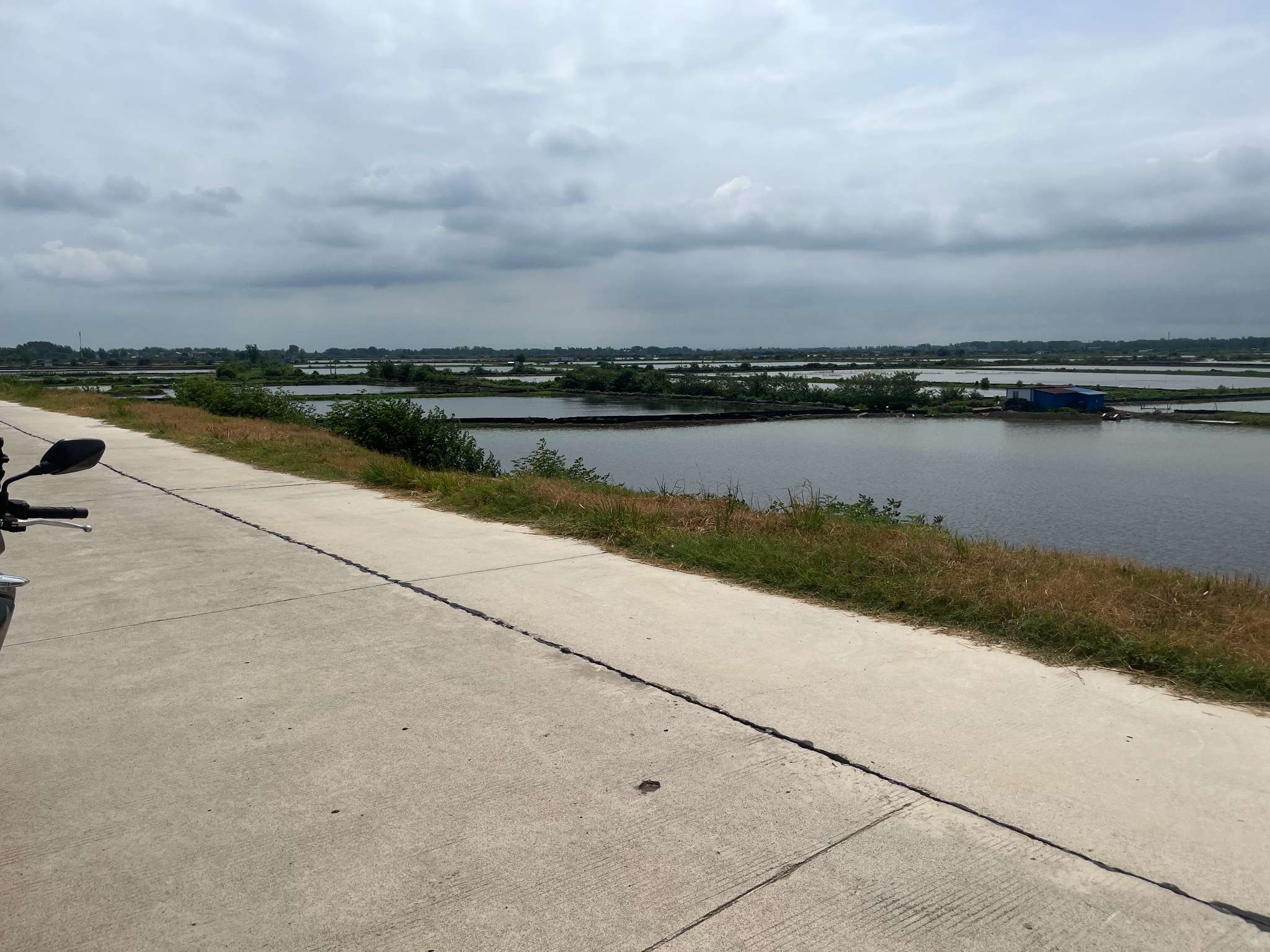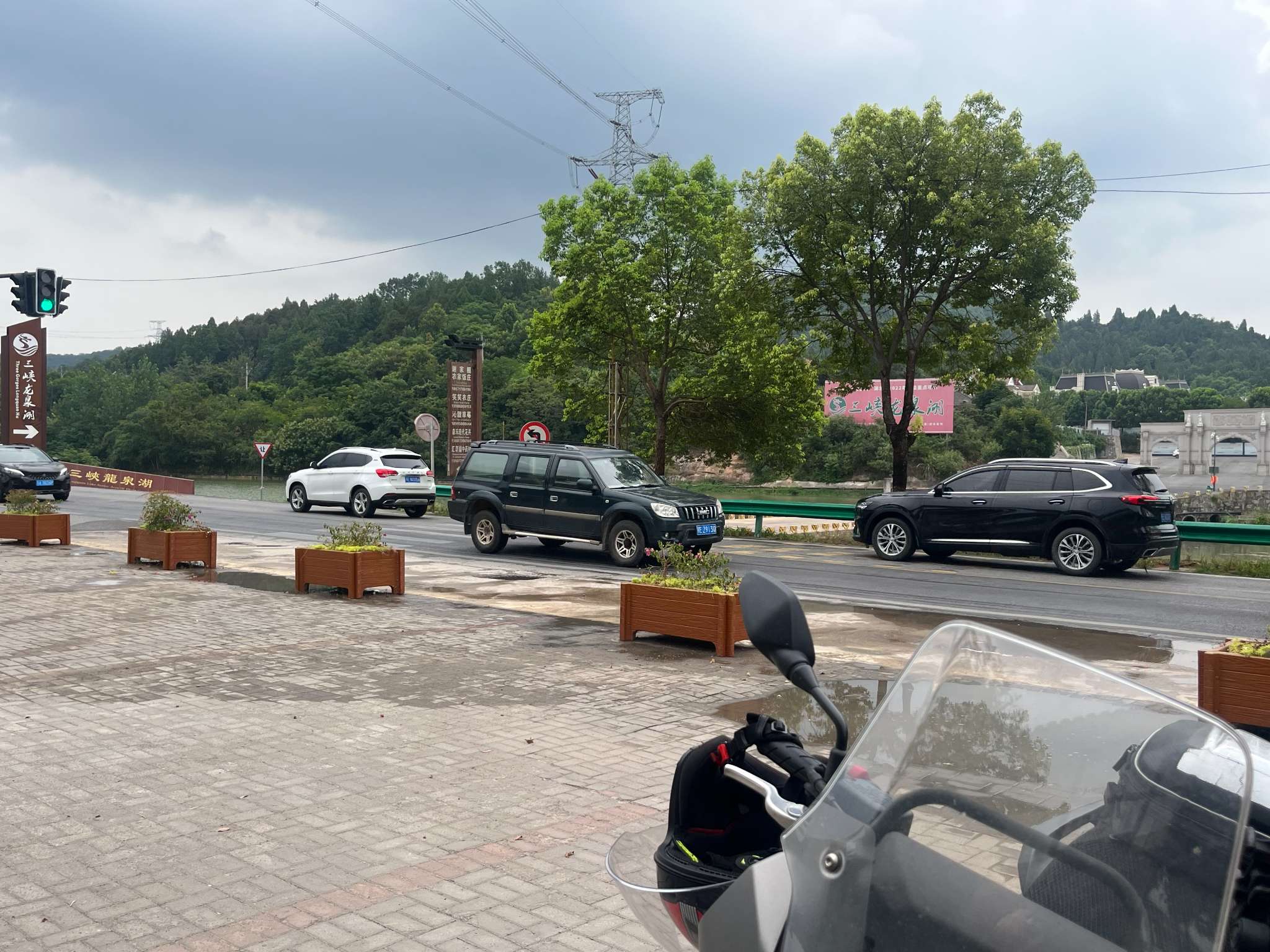 红绿灯多了起来,慢慢地走,被包围在一众鄂H中,我左右看找寻适合歇脚的完美地点——要好停车、好进出、有零食店。看到了路牌上关公大道、云长路等,但似乎没有中意的地方,要么没什么人,要么人太多。天上下起毛毛雨,地已经湿了,一些进出热闹地方的路口拥堵着,只好小心地避开一边看天上的雨一边看地下的水慌忙穿行马路的人和电瓶车,直行而去。错过一个路口,调头再转向深圳大道时,街边只有显得冷清的高大建筑,这是出城的路。车越来越少,路越来越宽,经过了尉迟恭路,在一个农家乐指示牌附近,我减速靠边刹停放边撑熄火,摘去头盔手套护具,看看身上没有湿。这里雨没下了,天空中有几缕阳光从云层间缝隙射下来。把带着的水喝了半瓶,侧身坐在车上,把靴子也脱掉,脚悬在发动机周围的热空气里,打开手机外放播放音乐,听那歌词道:“多少人走着,却困在原地,多少人活着,却如同死去...”。计时20分钟到了就穿上装备继续走起来。