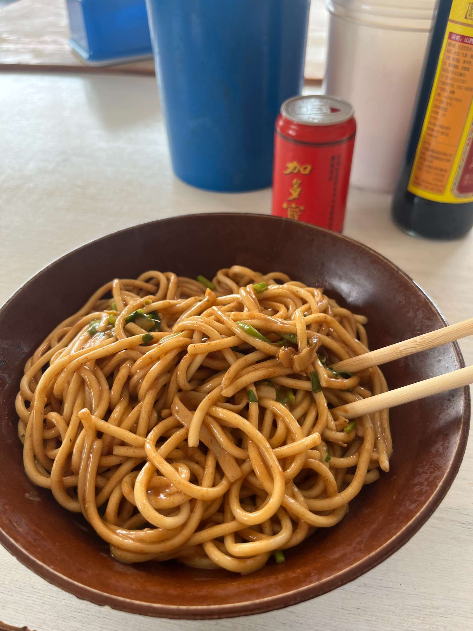第二天醒来时,逐一摸了摸昨晚湿的衣物都已经干了。我出门吃早餐。在晴天下的街道来回转了转,走进了一家“万州特色面馆”,看菜单上有小面、热干面、米粉、炒菜等。店是两位老人在经营,此时无其他食客,四五张简易小桌都空着,有些碗筷残食还未收拾。我立在柜台点了热干面付了5元钱,看那老妇人拿起一把面条丢进汤锅里,汤锅和我家用的差不多大小,外表黑黄且凹凸不平,似已服役多年,一会儿锅里冒起热气。我转身又去看墙上菜单,又看那老爹弯腰抹桌子。再回头看面已经用长筷子捞出来,放到一个瓢里。案板上摆放着各色调料,蒜汁水、盐、酱油等等,还有更多是不太认识的。只听说每样料都有各家自己的独特配方,即便是同一种,加多加少也全凭那一瞬间的肌肉记忆,各有门道。苍老的手已经往瓢里挑了几样粉末和碎屑,在钢盆里舀了点卤汁,又捏了两下塑料瓶喷出有颜色的水,仍拿起长筷子搅拌起来。我离了柜台退后两步找凳子坐下,妇人停止了搅拌,歪着脑壳一手竖起瓢一手用筷子拨着面倒进碗里。头上几根银丝在水汽中闪闪发亮,早晨的阳光不知从哪里溜进了这昏暗店里。收了瓢和筷子,拿起块布抹了碗沿,将碗放在台面上。老爹不抹桌子了,慢慢走近台前,端起碗捧到我面前的桌上放下。我低头看到黄褐色碗里,最上面是香菜沫,面拌得很匀,卖相比武汉常用的一次性纸碗装的、还需要自己来拌的更好,赶时间的人往往稍微搅两下就大口大口地吃上了,有眼前这么仔细拌的时间,一碗都干完了。当然武汉热干面也有用大瓷碗的,只是去往1996年的时光机票尚难搞到所以不得见。此时我早已从桌上筷篓里抽出了一双筷子,挽起面吃起来,感觉味道很特别很好吃,一会儿就吃得干干净净。复合着的芝麻酱味、香菜味、麻味、咸味在嘴里回味。列位看官,这吃食的味道果真如何恐怕只能用自己的舌头才能尝到。且有俗语道“此之甘饴,彼之砒霜”,又有“众口难调”。比起观察角度不同产生的“偏见”,用舌头尝更是各得其味,“偏见”甚于眼睛。何况味觉不像视觉有那般广泛应用的信息转化、采集、存储、传播方法。作者笔力未逮,难用文字辩明其一二。