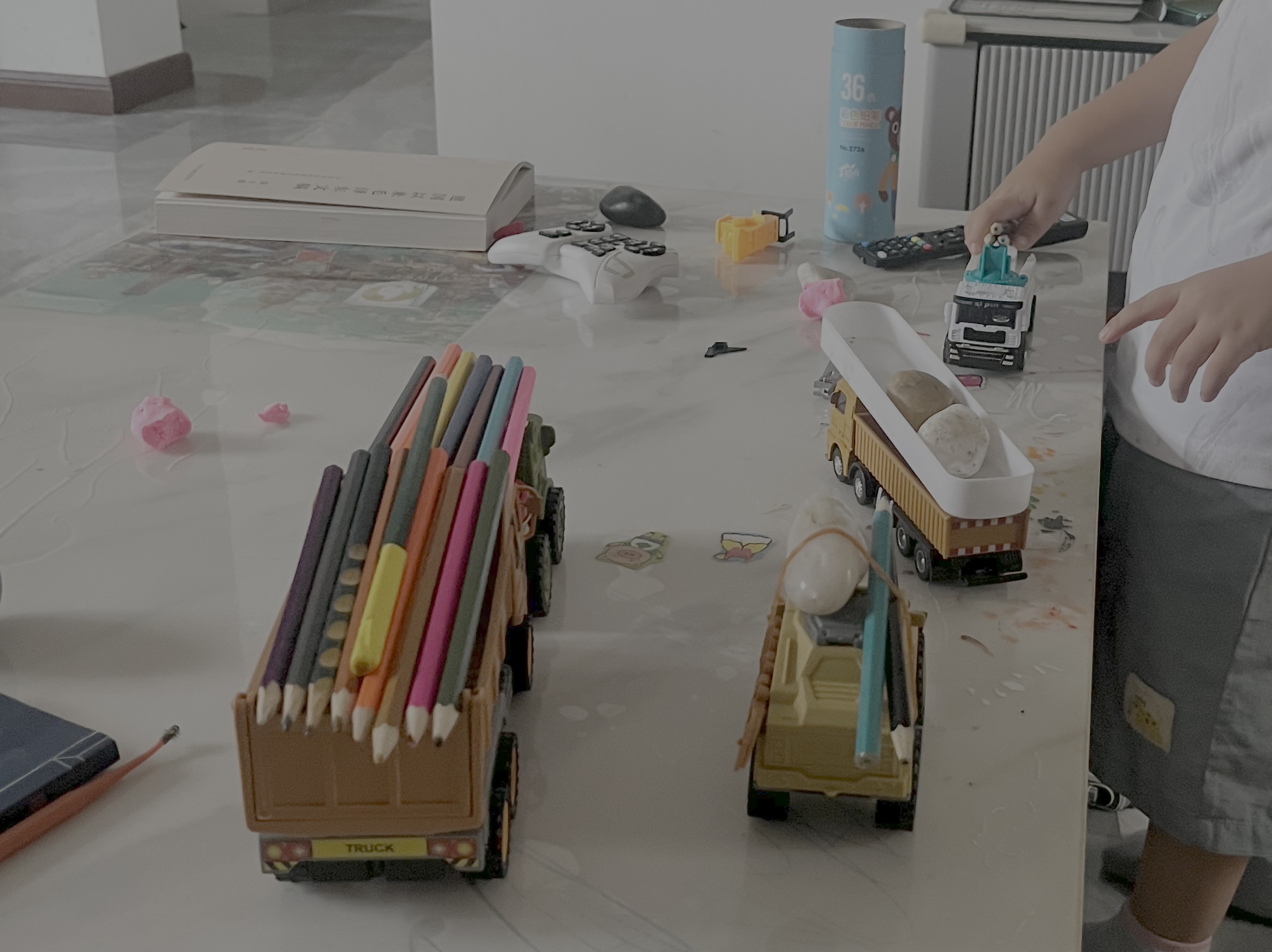 后记:周末在家带娃,看了一些动画片,我说:“再看大人看的电视”,翻了电影频道、体育频道等回放也没什么好看的。然后看到阅兵有回放,于是点开看。不想娃也爱看,对着那些“惊雷”、“巨浪”、“鹰击”问这是什么,那是什么。我只能说“导弹”。他将几种玩具车,有工程车,有军车一起摆放成一列一列的,想了想,把那36色铅笔整齐地排列在上面,问“像不像?”,