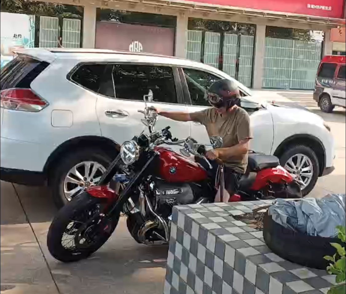 9.3早上送完娃去幼儿园,我就出发了。在店门前停车时,看到了辆红色的R18,车把手上安装了流苏。